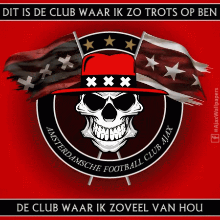 AFC Ajax logo featuring a skull in a hat, with Dutch text expressing pride and love for the club.