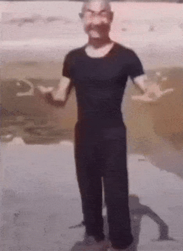Akai makes exaggerated and funny facial expressions while standing by the water.