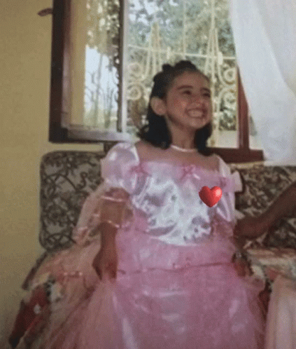 Akbolat Şevval smiles brightly in a pink princess dress, with a red heart on her chest.
