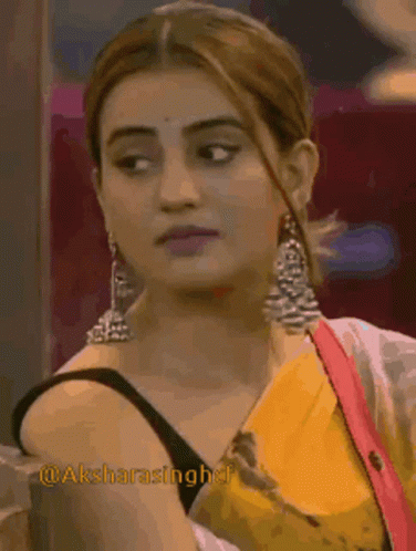 Akshara Singh, the Bhojpuri Queen, reacting in Bigg Boss, wearing a yellow saree and traditional earrings.