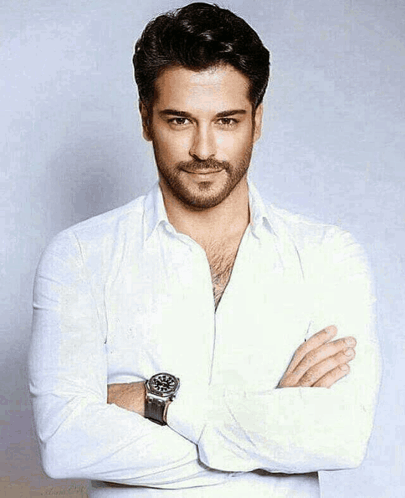 Turkish actor Burak Özçivit in a white shirt, arms crossed, looking at the camera.