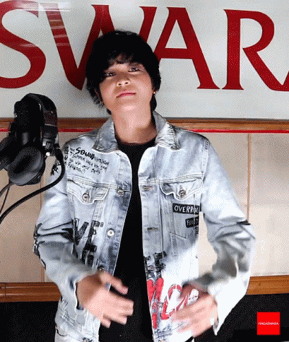 Mita The Virgin makes a heart gesture, wearing a stylish denim jacket in a studio setting.
