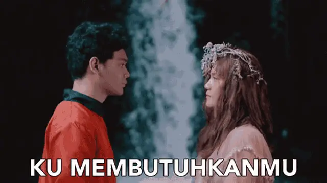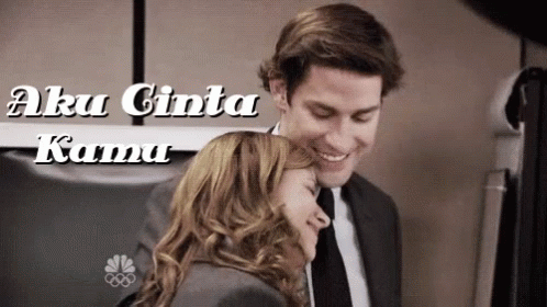 Jim and Pam share a loving embrace with the words 'Aku Cinta Kamu' (I Love You) displayed.