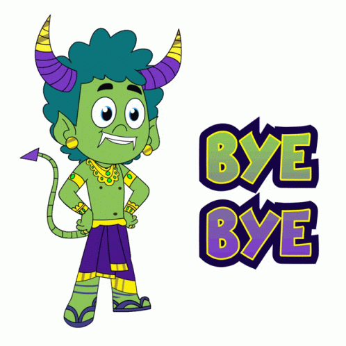 Akul, a green cartoon character with horns, waves goodbye next to 'Bye Bye' text.