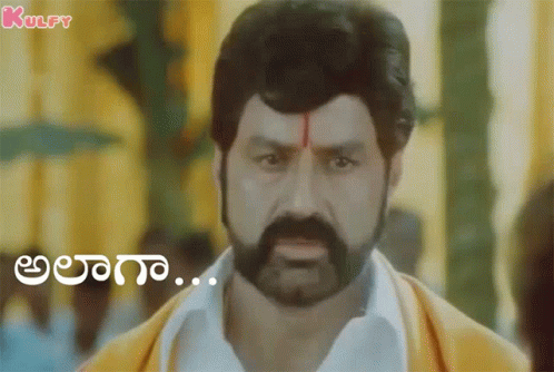 Balakrishna from Simha Movie reacts with 'Alaagaa...' (Is that so?), wearing a yellow shawl and a tilak.