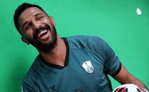 Al-Owais, the Al-Hilal goalkeeper, smiles broadly while holding a soccer ball.