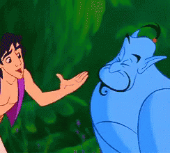 Aladdin laughs as Genie, transformed into Pinocchio, tells a lie and his nose grows, hitting Aladdin.
