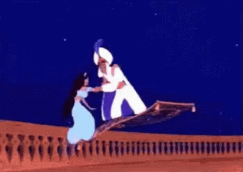 Aladin and Jasmine fly on a magic carpet, followed by a magical explosion in the night sky.