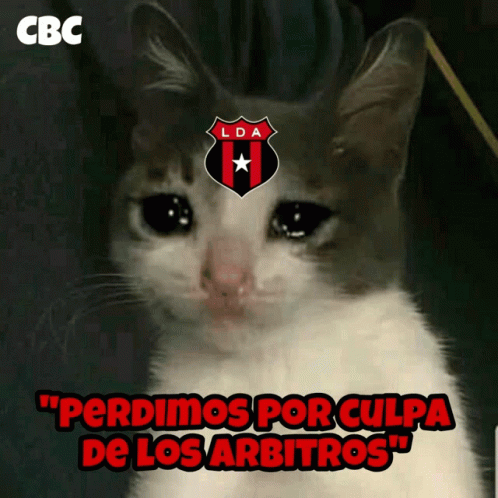 Crying cat meme featuring the LDA logo, complaining about losing due to referees, referencing the Alajuela Saprissa rivalry.