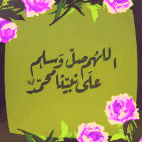 Arabic calligraphy of a prayer for Prophet Muhammad, adorned with vibrant purple roses on a green background.