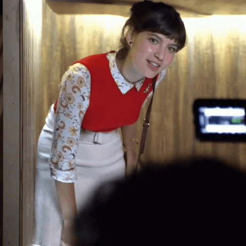 Alanis Guillen as Rita Malhação smiles, wearing a red vest over a floral shirt and a white skirt.