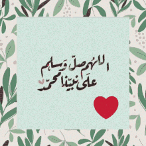 Arabic calligraphy of 'O Allah, send prayers and peace upon our Prophet Muhammad' on a floral background with a red heart.