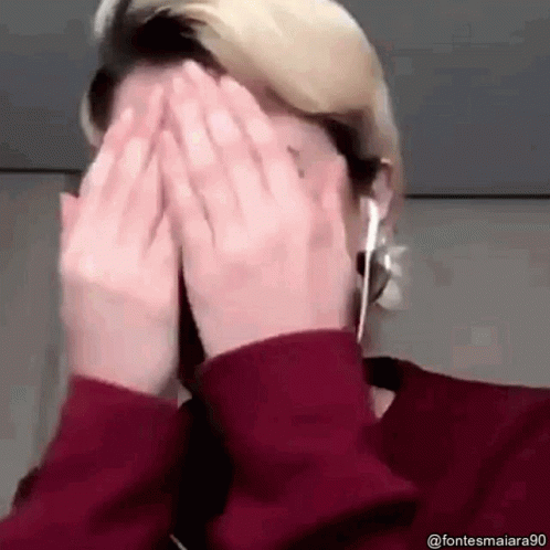 Alba Reche covers her face with her hands, then reveals a big smile, wearing headphones and a red sweater.