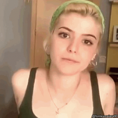 Alba Reche, wearing a green headband and necklace, makes a subtle expression for the camera.