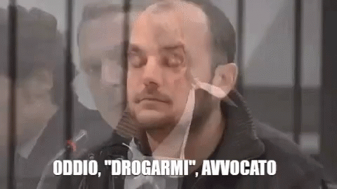 Alberto Biggiogero speaks in court during 'Un Giorno In Pretura', with captions reading 'OH GOD, "DRUG ME", LAWYER'.