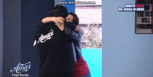Alberto Urso and Ramona share a heartfelt hug during the 'Fase Serale' of Amici, an Italian talent show.