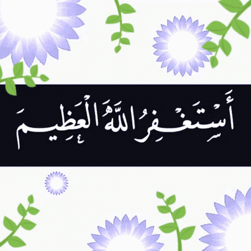Arabic calligraphy 'Astaghfirullah al-Azeem' (I seek forgiveness from Allah, the Almighty) surrounded by purple flowers and green leaves.