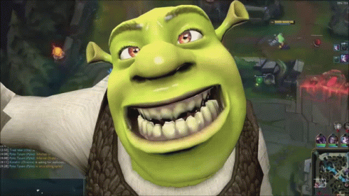 Alderiate's Shrek character smiles widely, superimposed on a video game screen, creating a humorous meme.