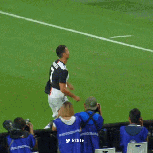 Cristiano Ronaldo, wearing his Juventus number 7 jersey, performs his iconic 'Siuuu' celebration on the football field.