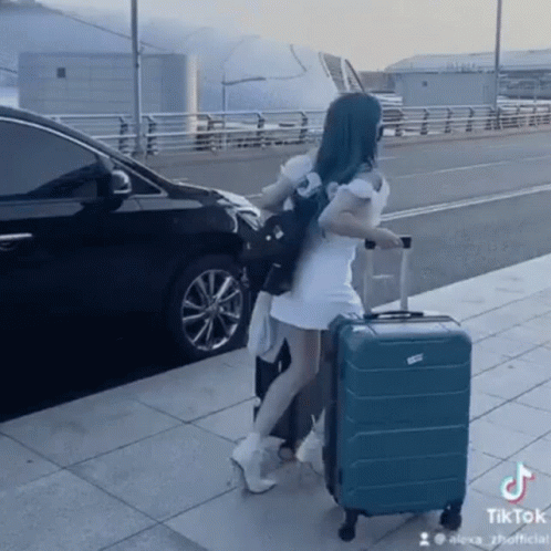 Ale Xa, a Kpop artist, walks with her suitcases, pushing them along a sidewalk, dressed in white.