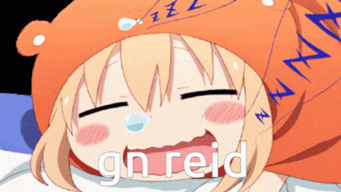 Cute cartoon girl, possibly Alec Ried, sleeping with 'gn reid' on her face, dreaming sweetly.
