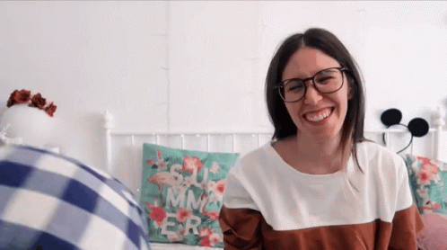 Sara Pecas laughing happily, wearing glasses, and sitting on a bed with a 'SUMMER' pillow.