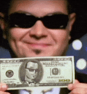 Mexican musician Aleks Syntek, wearing sunglasses, holds up a custom $100 bill with his face on it.