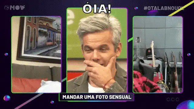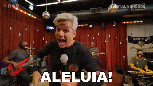 Otaviano Costa energetically sings 'Aleluia!' into a microphone, surrounded by his band in a lively studio.