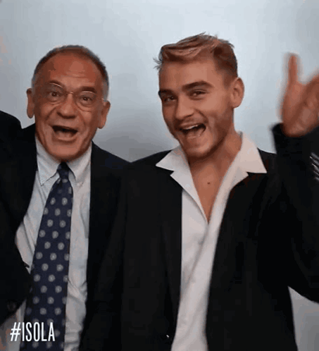 Alessandro Cecchi Paone and Simone Antolini wave, celebrating their appearance on Isola Dei Famosi.