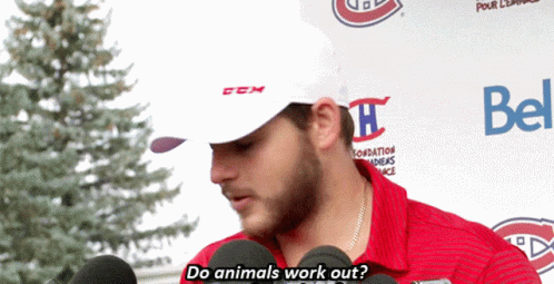 Alex Galchenyuk, wearing a CCM hat and red shirt, poses a curious question to reporters: 'Do animals work out?'