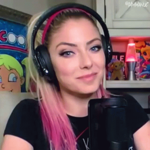 Alexa Bliss, with pink hair and headphones, shows a surprised reaction during an interview or podcast.
