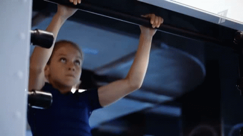 Figure skater Alexandra Trusova demonstrates her strength with powerful pull-ups in a gym setting.