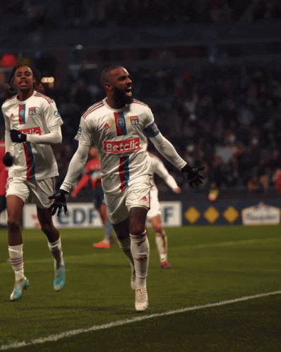 Alexandre Lacazette, wearing his white Lyon jersey, celebrates scoring a goal on the soccer field.
