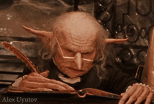 A Harry Potter goblin, from Alex Uyutov, diligently writing in a large book with a quill.
