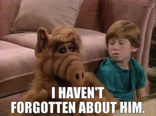 Alf the puppet sits with a young boy, with the text 'I Haven't Forgotten About Him'.