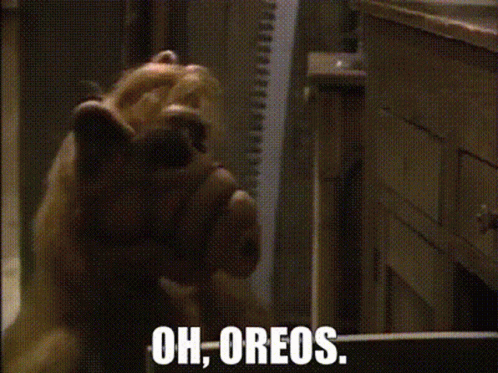 Alf the alien puppet expresses delight while holding a package of Oreo cookies, exclaiming "Oh, Oreos."