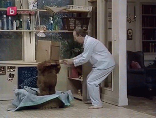 The alien puppet Alf gets a cardboard box placed over his head by a man in pajamas, looking surprised.