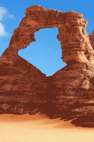 A stunning heart-shaped natural rock arch stands majestically in the vast Algerian desert.