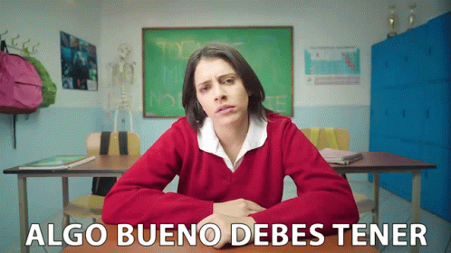 A young woman in a red sweater sits in a classroom, speaking directly to the camera about having something good.