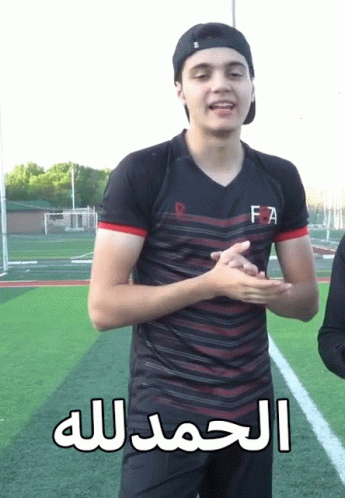 Bashar Arabi expresses gratitude, saying 'Praise be to God, thank you' while on a sports field.