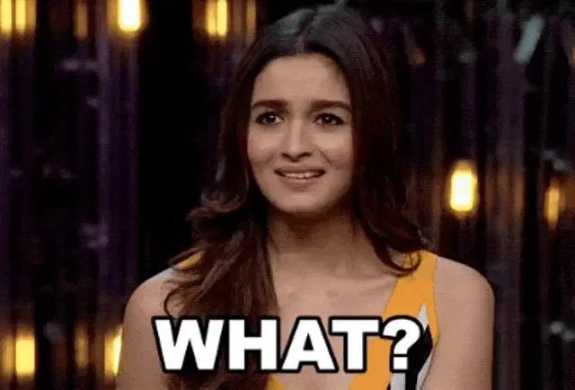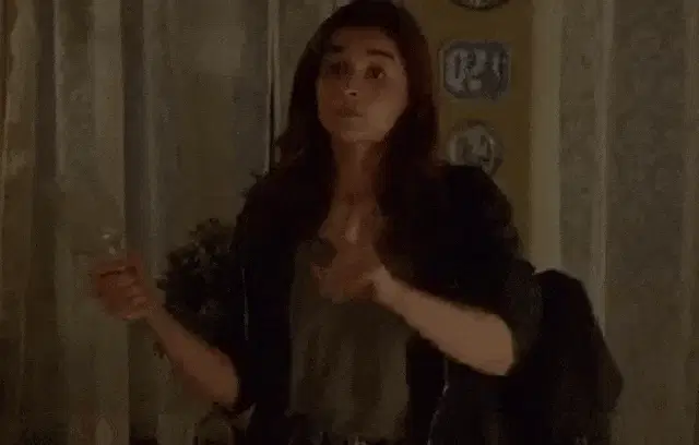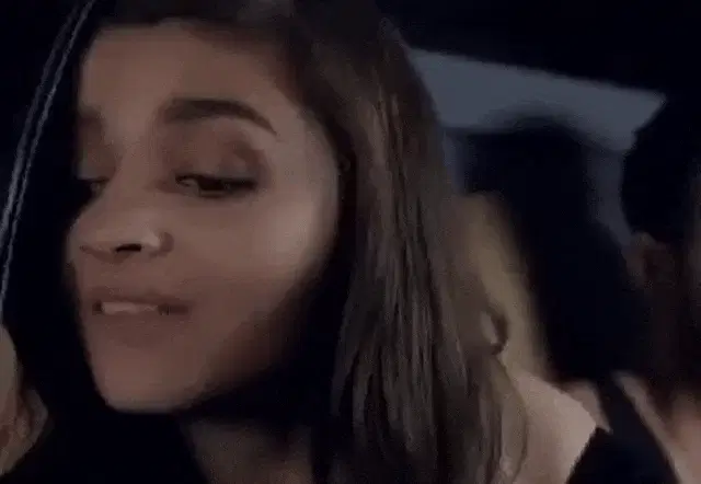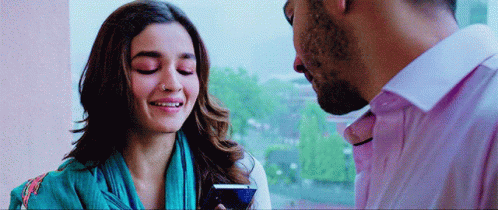 Alia Bhatt smiles while looking at a man, holding a cell phone in a modern setting.