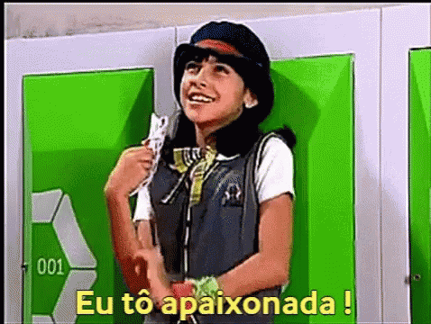 Alicia Carrossel expresses her love, exclaiming 'Eu tô apaixonada!' with a joyful smile in front of green lockers.