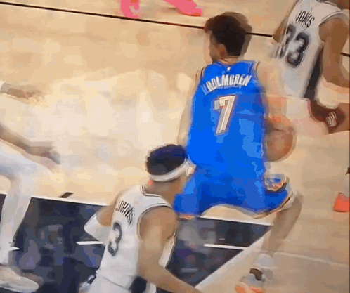 Chet Holmgren falls to the court after contact with Victor Wembanyama during a basketball game.