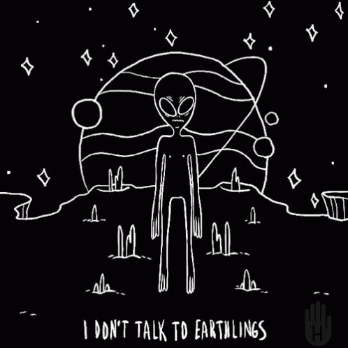 A black and white drawing of an alien standing on a planet with the text 'I DON'T TALK TO EARTHLINGS'.