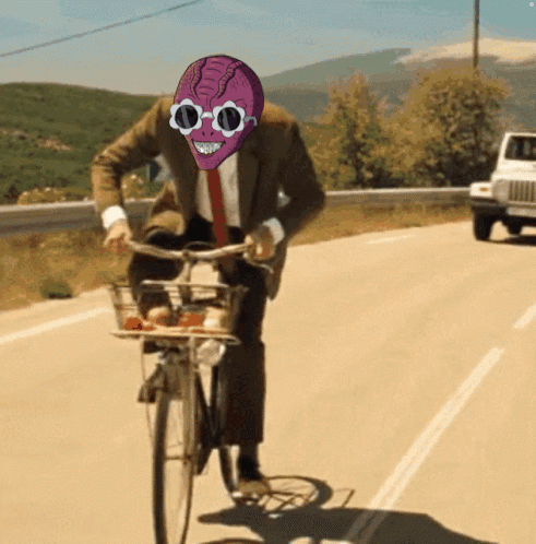 A humorous meme featuring a character with an alien head on a bicycle, being chased by a car labeled 'FUD', referencing Aliens Colony NFT.