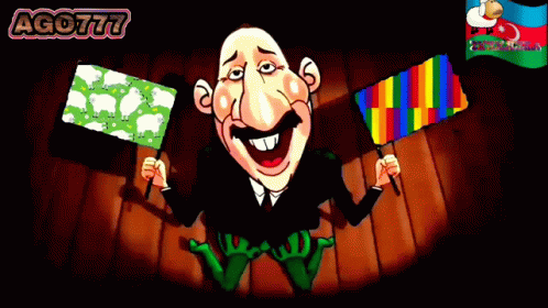 Caricature of Ilham Aliyev holding a sheep flag and a rainbow flag, making sheep sounds.