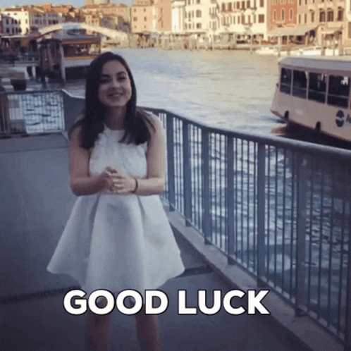 Alina, in a white dress, blows a kiss with a "Good Luck" message from a scenic pier in Venice, Italy.
