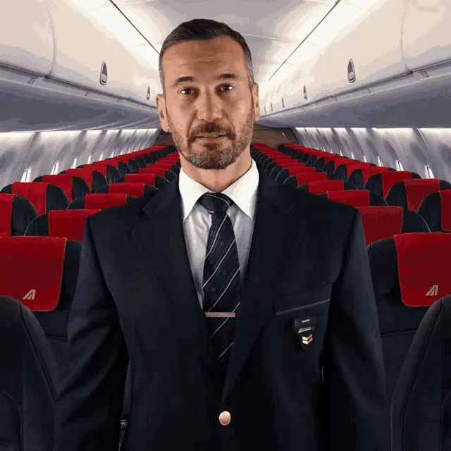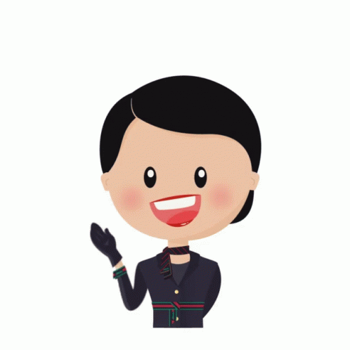 A cheerful cartoon illustration of an Alitalia stewardess in uniform, waving a friendly greeting.
