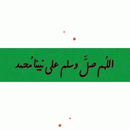 A green banner with Arabic calligraphy 'O Allah, send prayers and peace upon our Prophet Muhammad' and floating red hearts.