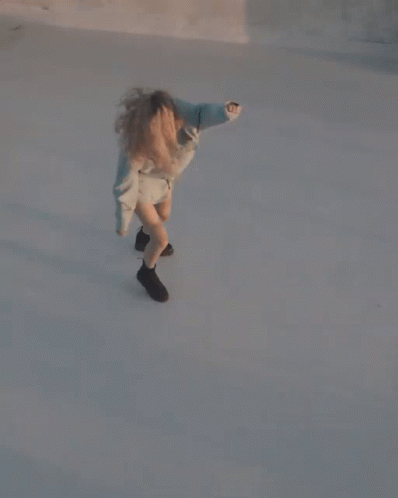 Alkistis Ziro energetically dances and jumps, with her hair flying, on a plain outdoor surface.